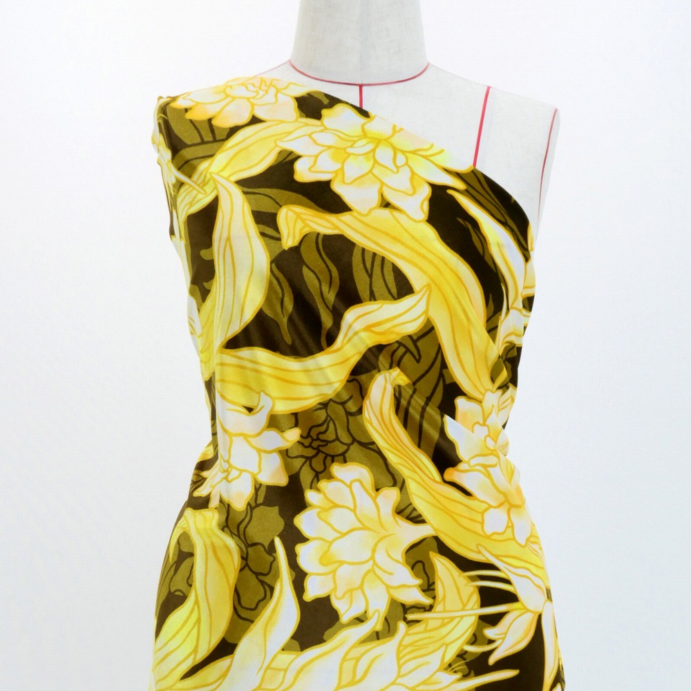 ハワイアン生地 チューブローズ柄 コシボ・シャンタン・ストレッチベロア選べる生地 イエロー×カーキ KH-624-YEKA 3-5営業日後発送