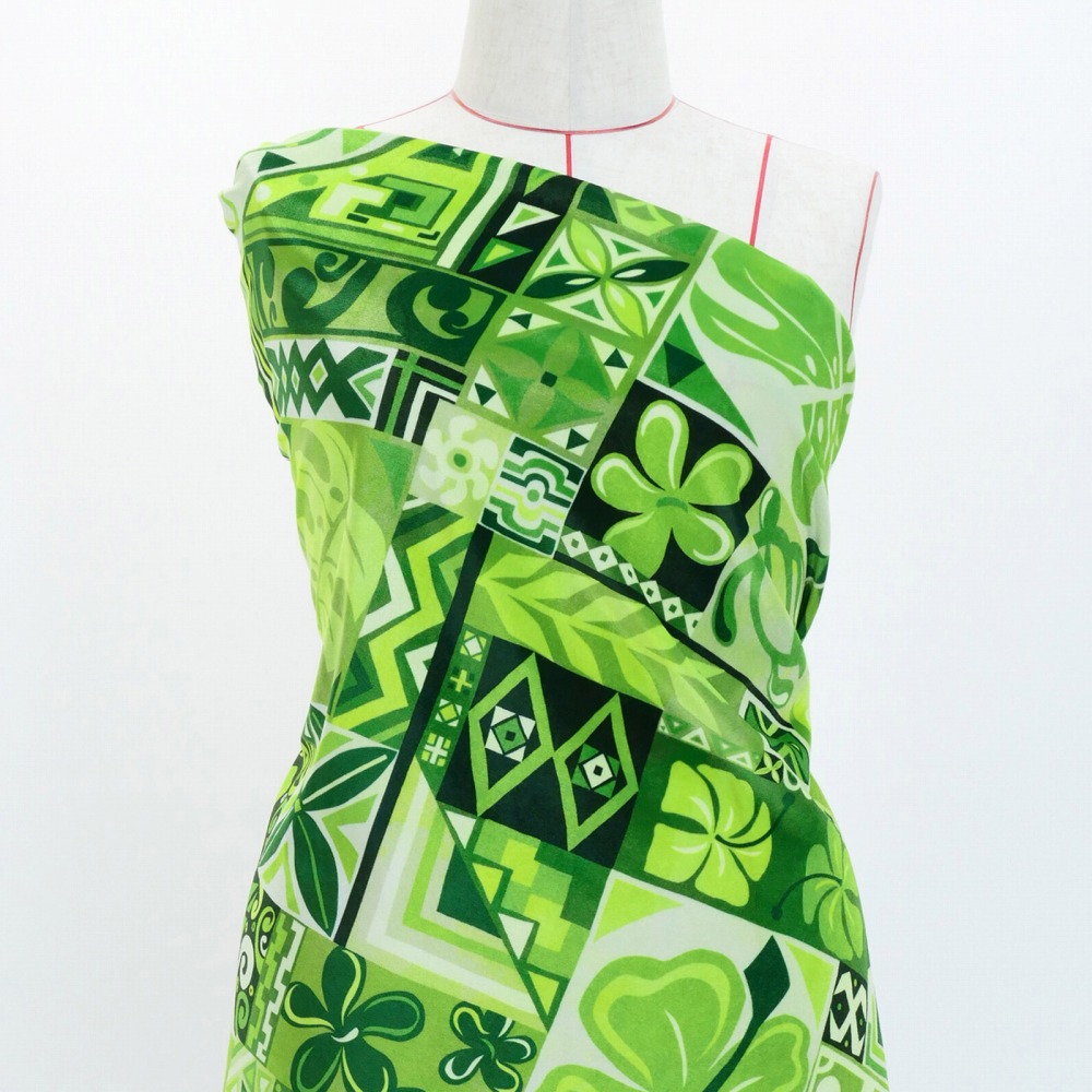 ハワイアン生地 ハワイアン スクエアデザイン柄 コシボ・シャンタン・ストレッチベロア選べる生地 グリーン KH-626-GR 3-5営業日後発送