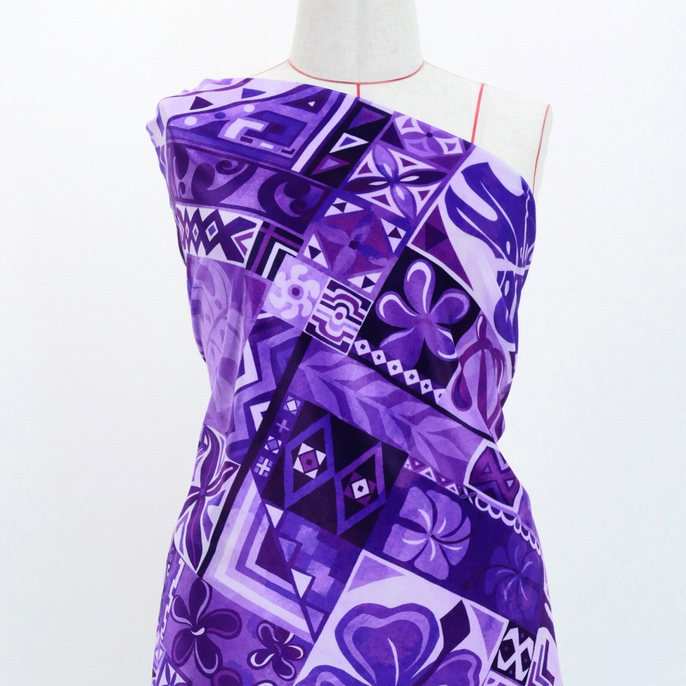 ハワイアン生地 ハワイアン スクエアデザイン柄 コシボ・シャンタン・ストレッチベロア選べる生地 パープル KH-626-PU 3-5営業日後発送