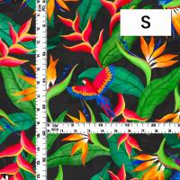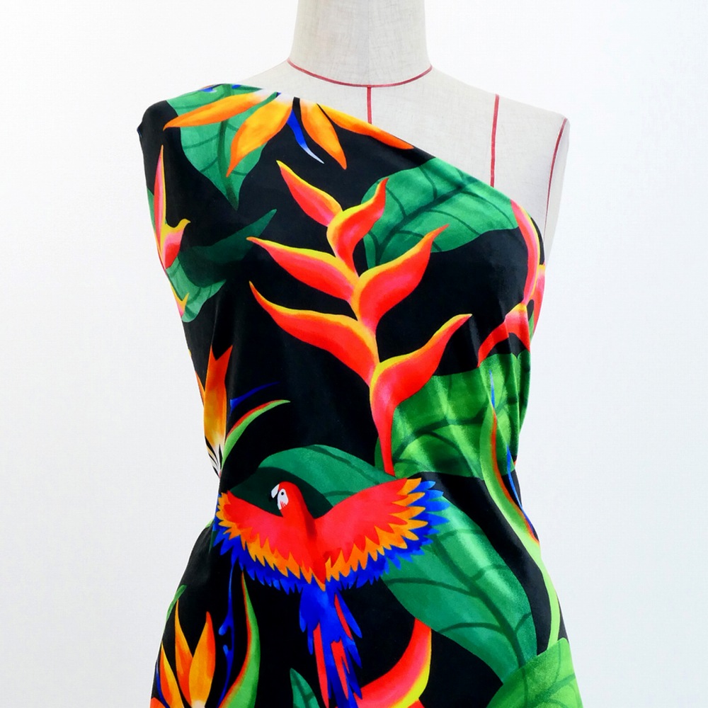 ハワイアン生地 トロピカルバード柄 コシボ・シャンタン・ストレッチベロア選べる生地 ブラック KH-632-BK 3-5営業日後発送