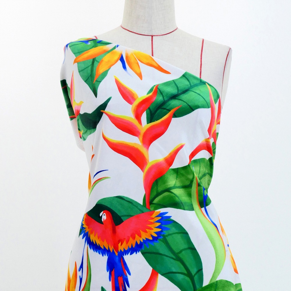 ハワイアン生地 トロピカルバード柄 コシボ・シャンタン・ストレッチベロア選べる生地 ホワイト KH-632-WH 3-5営業日後発送