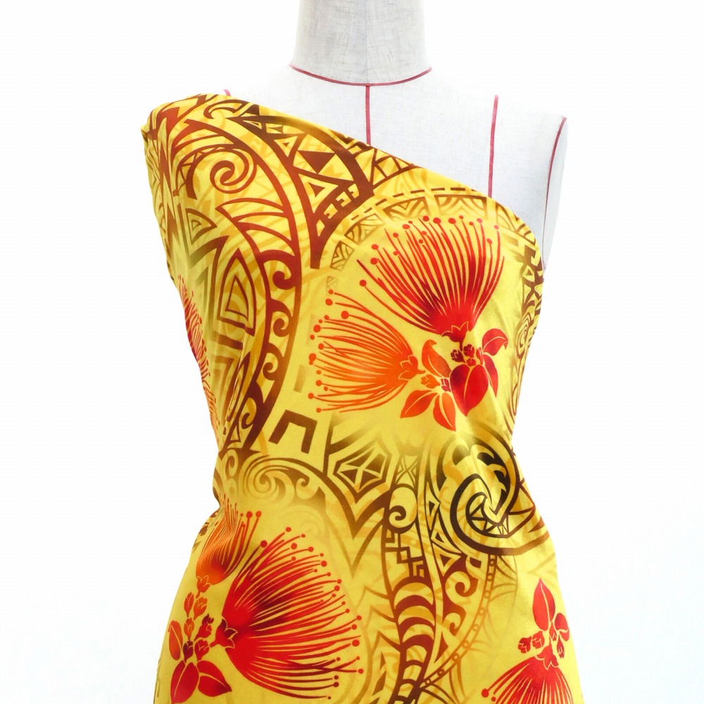 ハワイアン生地 カヒコ×レフア柄 コシボ・シャンタン・ストレッチベロア選べる生地 イエロー KH-660-YE 3-5営業日後発送
