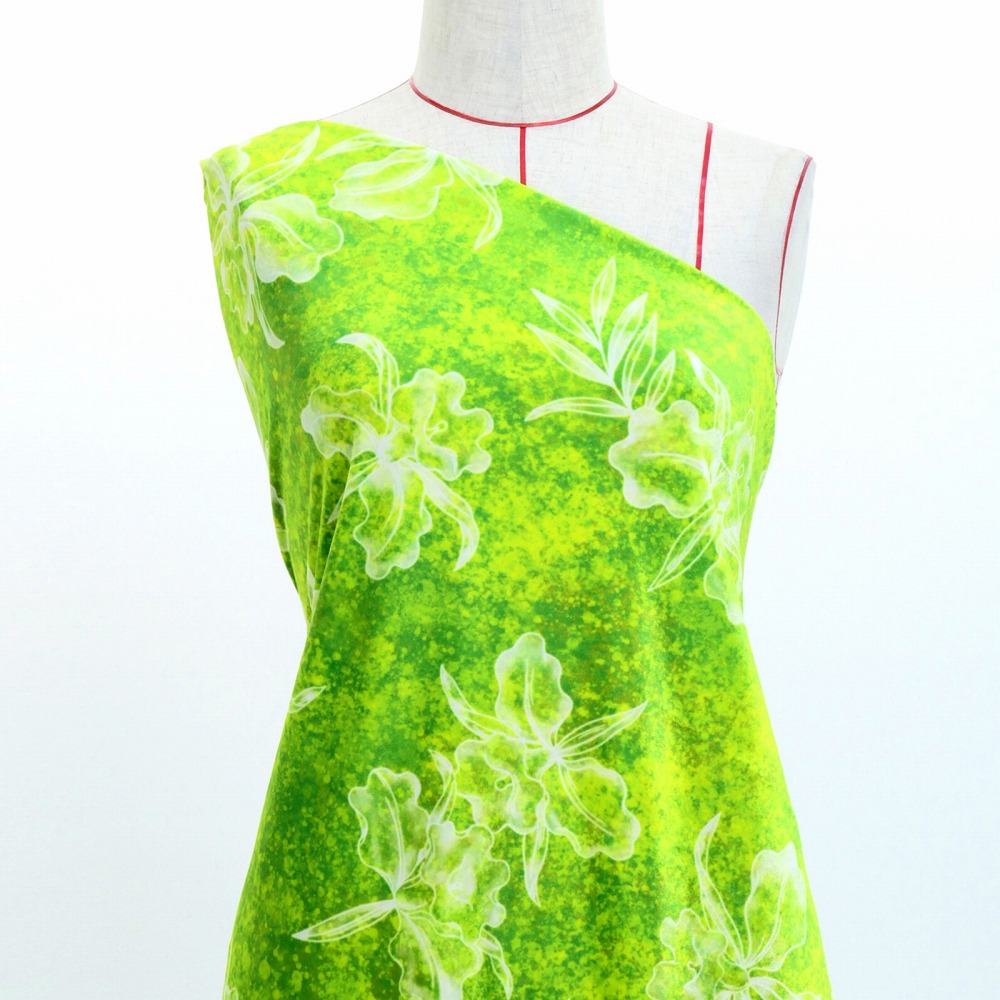 ハワイアン生地 オーキッド柄 コシボ・シャンタン・ストレッチベロア選べる生地 イエローグリーン KH-664-YEGR 3-5営業日後発送