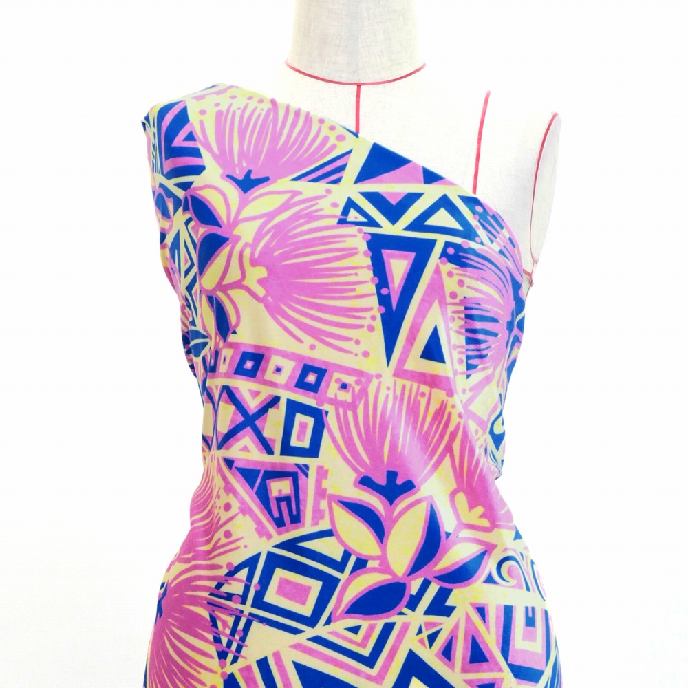 ハワイアン生地 カヒコ&レフア柄 コシボ・シャンタン・ストレッチベロア選べる生地 ピンク×ブルー KH-680-PIBL 3-5営業日後発送