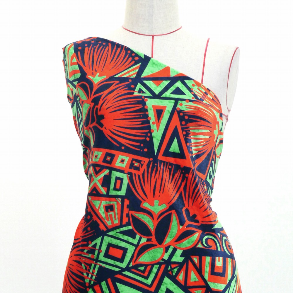 ハワイアン生地 カヒコ&レフア柄 コシボ・シャンタン・ストレッチベロア選べる生地 レッド×ターコイズブルー KH-680-RDTBL 3-5営業日後発送