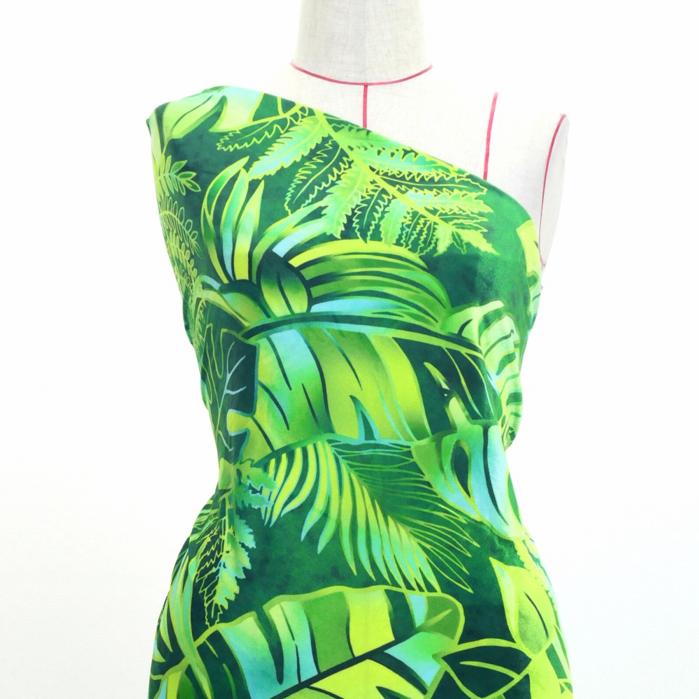 ハワイアン生地 ハワイアンリーフ柄 コシボ・シャンタン・ストレッチベロア選べる生地 ダークグリーン KH-682-DGR 3-5営業日後発送