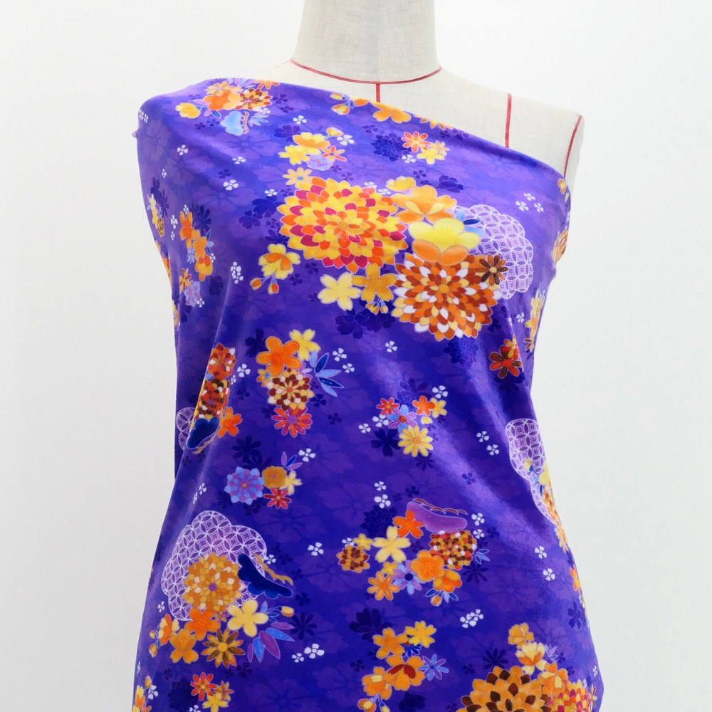 和柄生地 菊&梅&桜柄 コシボ・シャンタン・ストレッチベロア 選べる生地 パープル(紫) WA-005-PU 3-5営業日後発送