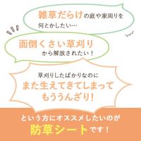| ご注意下さい | シートの効果や耐久性は使用環境により異なります。 砂利や人工芝の下敷き専用の防草シートになります。 紫外線劣化防止加工がされておりますが、そのままで使用しますと雨や風、紫外線にさらされ破れて劣化してしまう場合がございますので必ず下敷きとしてご使用ください。 チガヤ・ススキ・ヨシ・イタドリ・スギナなどの強雑草には対応しておりません。 |