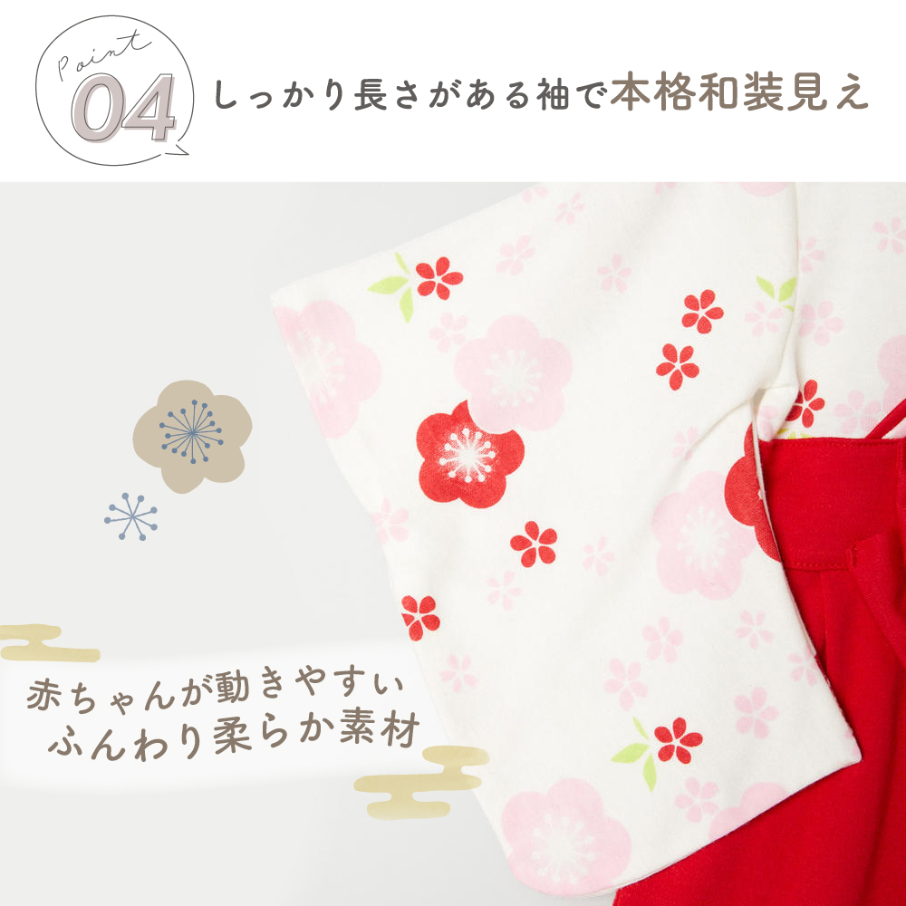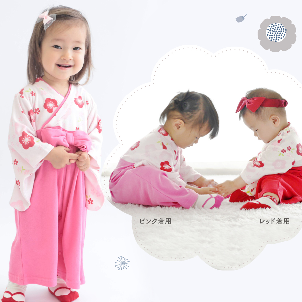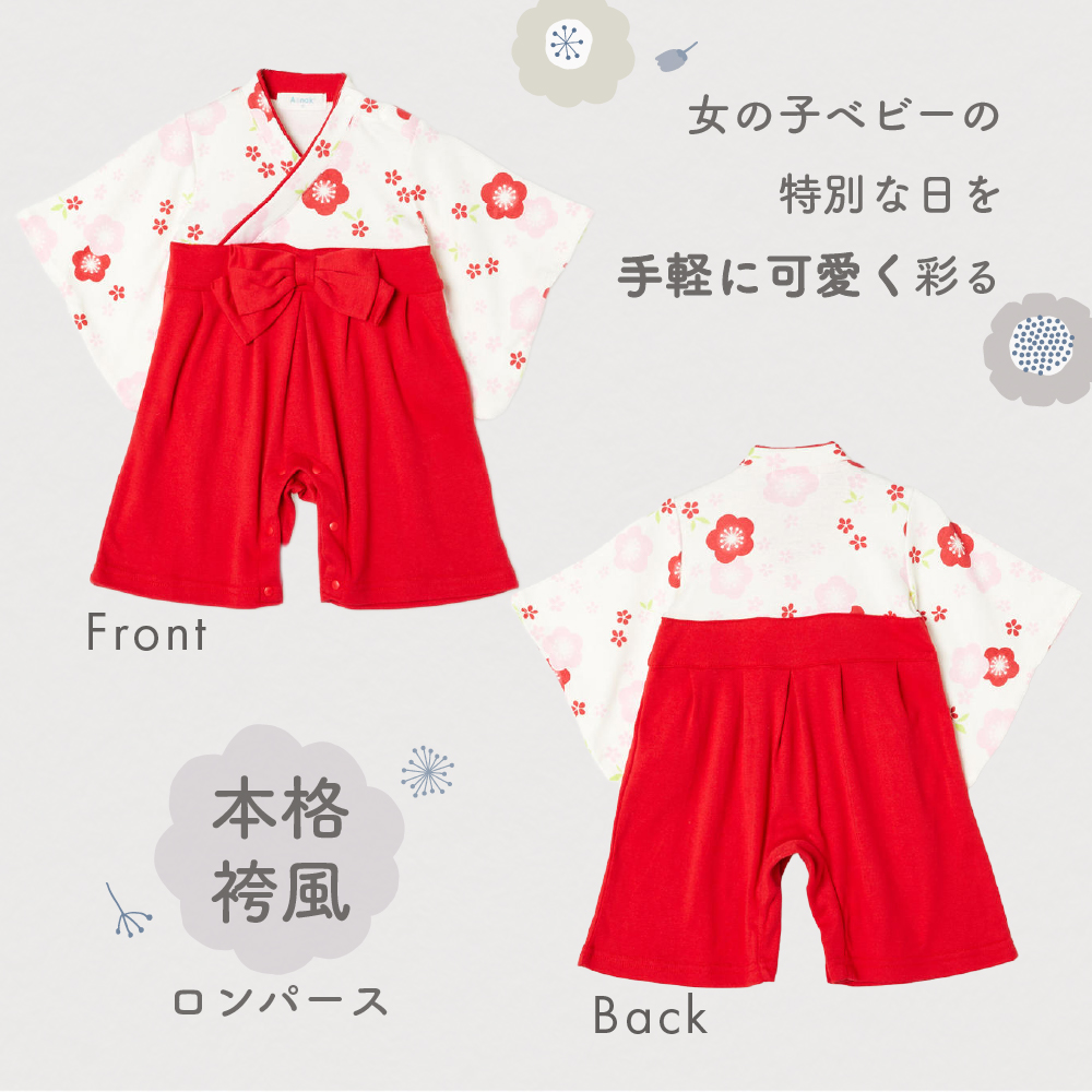 袴ロンパース 女の子 60 70 80 90 ベビー 赤ちゃん ロンパース 髪飾り レッド ピンク 60 70 80 90