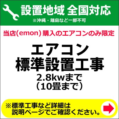 ※商品は宅配業者が先に納品して、後日設置業者が設置ご希望日に伺って設置作業をいたします。※ご注文の際、備考欄に設置工事のご希望日を「第3希望まで」ご記入下さい。※時間指定はお受けできませんので予めご了承下さい。セパレートエアコンの標準設置作業です。部屋にエアコン用パイプ穴が無い場合の穴開け作業も料金に含まれます。室外機との配管(長さ4mまで)接続 外装処理いたします。室外機は 1階庭/ベランダで プラスチックブロックを敷いた上での設置となります。[注意]配管/配線は全て露出配線となります。壁面材質等により配管用穴開け料金が必要となる場合があります。特殊な設置では 別途料金が必要となります。設置場所が北海道地方の場合、建物に断熱材が使用されている関係上、別途下見作業のお申し込みが必要となります。各種作業は エアコンをご購入のお客様に限らせて頂きます。一部地域では設置作業をお受け出来ない場合があります。