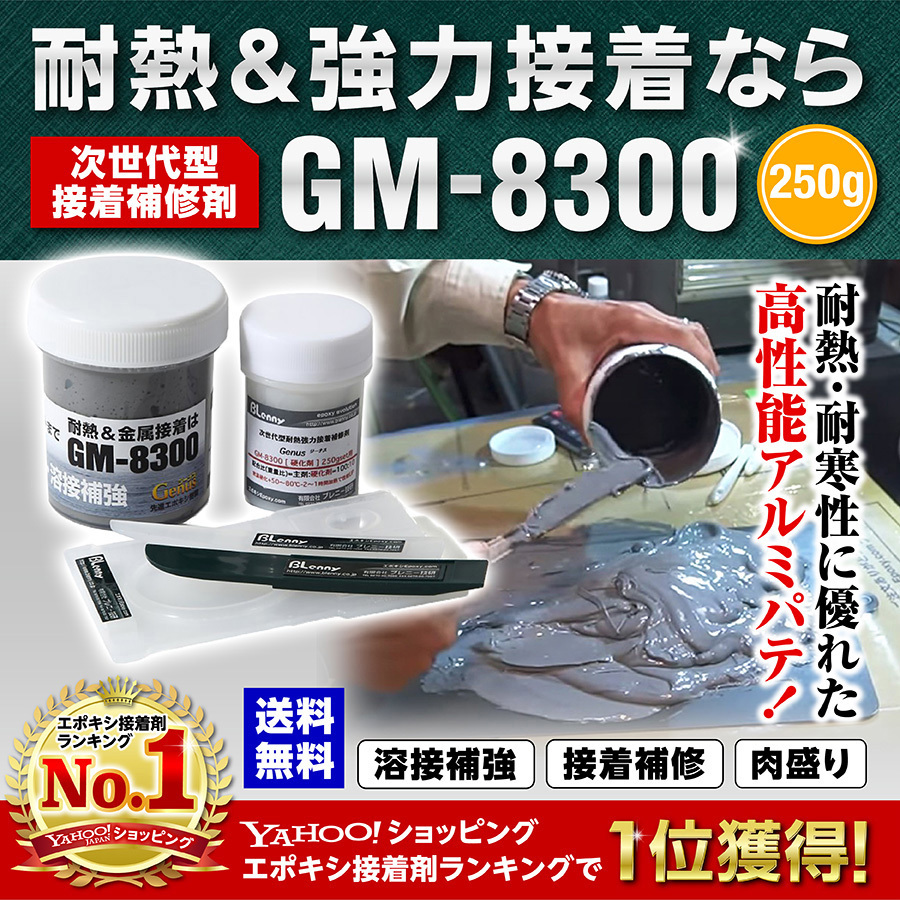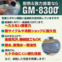 高性能な耐熱、耐油エポキシアルミパテです。 世界最高峰の性能を有するGM-8300は、次世代型接着補修剤です。 抜群の性能とコストパフォーマンス信頼性です。 低温でも脆化せず、高温でもへたらず寒暖を繰り返すヒートサイクルによる母剤収縮に追従し剥離しない「しなやかさ」を持つ高性能アルミパテです。 エンジン補修、マフラー補修、ネジ山補修等様々な用途に使用することができます。