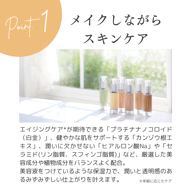 水、BG、グリセリン、クインスシードエキス、ヒアルロン酸Na、トレハロース、ナイロン-12(ナイロン末)、酸化ジルコニウム、ジメチコン、メチコン、リン脂質、スフィンゴ脂質、白金、ポリソルベート80、ルイボスエキス、カンゾウ根エキス、ブドウ葉エキス、ハマメリス葉エキス、セイヨウトチノキ種子エキス、セイヨウキズタ葉/茎エキス、セイヨウオトギリソウ花/葉/茎エキス、アルニカ花エキス、キサンタンガム、ポリアクリル酸Na、ヒドロキシエチルセルロース、トコフェロール、スルホコハク酸ジエチルヘキシルNa、クオタニウム-73、リゾレシチン、水酸化AI、フェノキシエタノール、(+/-)酸化チタン、酸化鉄、タルク、酸化クロム
