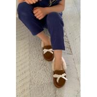 モカシンアッパーデザインのスライドスリッパの新製品。ウールファーのバックベルトも付いて外履きでも温かさとともに脱げにくい仕様。