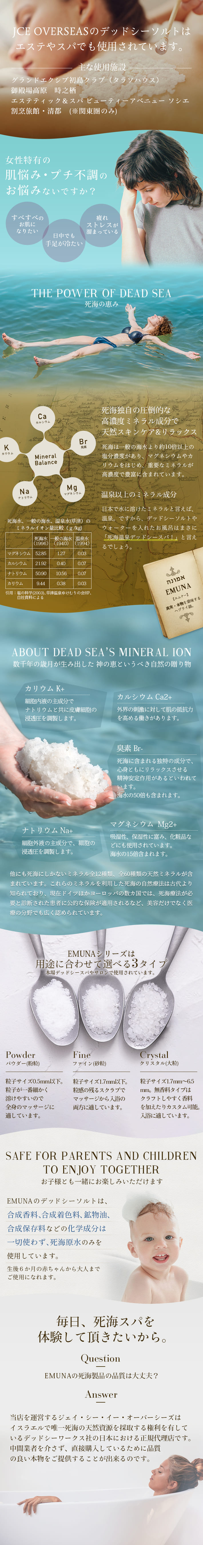 | 100g小袋入り、携帯にも便利な使い切りタイプです。 死海ミネラル塩は死海の海水をそのまま天日乾燥し結晶化させた天然塩で粒子径1.7mm以下の砂粒状バスソルトです。死海の海水は一般の海水と比べて、4倍のナトリウム、20〜45倍のカリウム、マグネシウム、カルシウムが含まれています。この死海の海水ミネラルをそのまま含んだ無着色、無香料のバスソルトです。 |