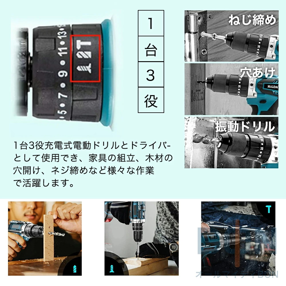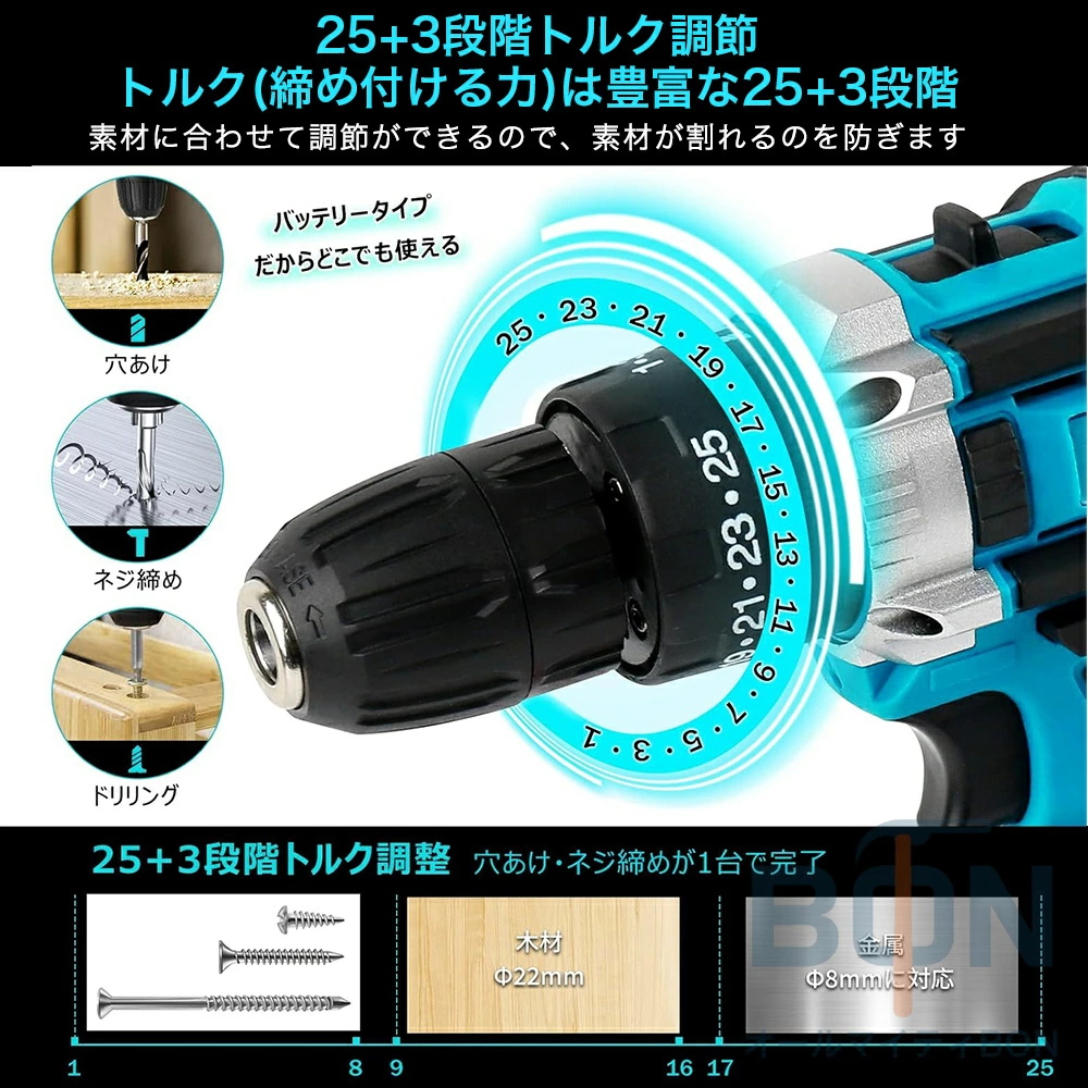 電動ドライバー セット 充電式 電動 ドライバー 小型 コードレス コンパクト 18V 最大50N.m 2Way 電源に対応 25+3段階トルク調節 スピード調節機能