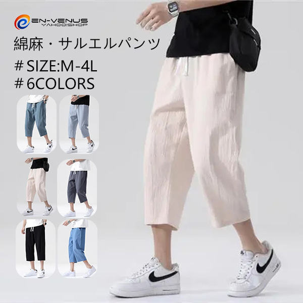 サルエルパンツ イージーパンツ ワイドパンツ メンズ 薄手 綿麻 吸汗 七分丈 ウエストゴム カジュアル 大きいサイズ ハロンパンツ ゆったり レジャー お兄系