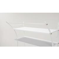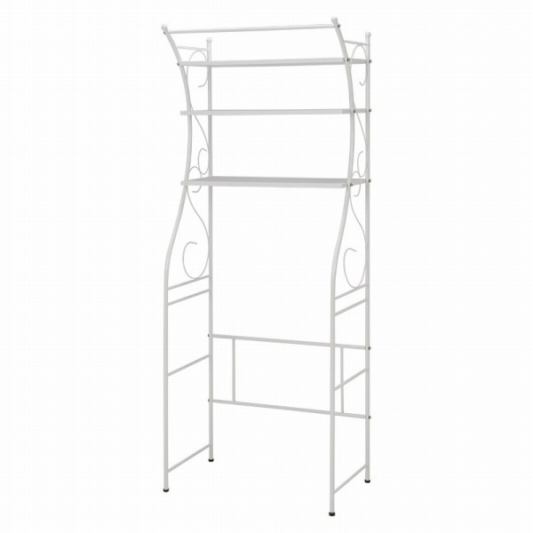 アイアンの曲線がエレガントで、デッドスペースを有効活用できる洗濯機ラック。上のバーは室内干しにも使えます。