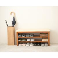 靴の脱ぎ履きに便利な玄関ベンチ。座面下は2段の棚で靴やスリッパの収納スペースになります。