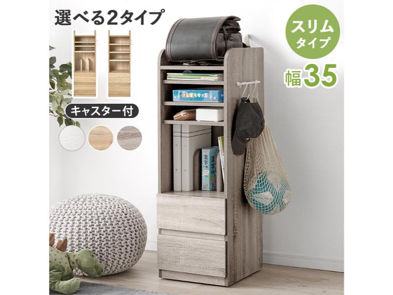 リビングにも置きやすいスリムタイプ。可動棚と引出し収納で教科書やプリント類、文房具なども収納可能。片付けの習慣づけに。