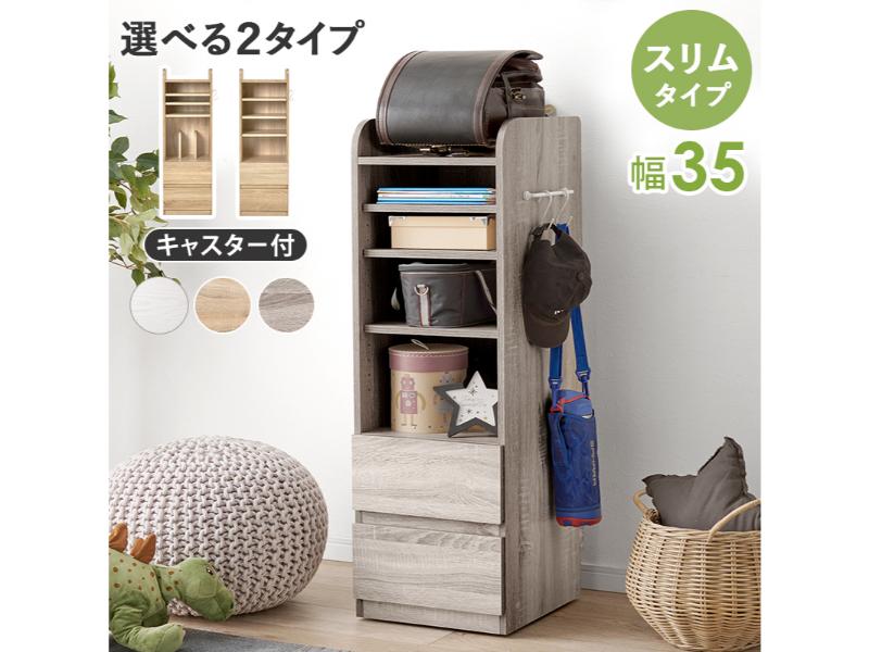 リビングにも置きやすいスリムタイプ。可動棚と引出し収納で教科書やプリント類、文房具なども収納可能。片付けの習慣づけに。