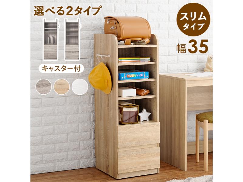 リビングにも置きやすいスリムタイプ。可動棚と引出し収納で教科書やプリント類、文房具なども収納可能。片付けの習慣づけに。