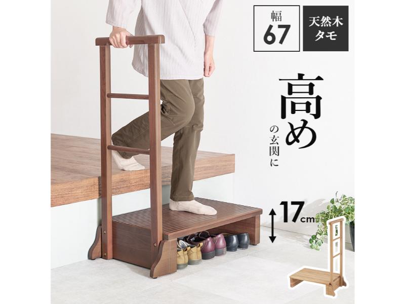 タモ材の木目が美しい、安心で便利な手すり付きの玄関踏み台。手すりを使って体を支えることでひざへの負担を減らし、段差の昇り降りが楽になります。