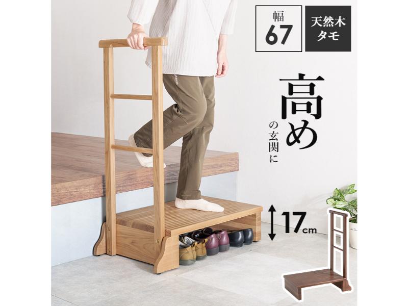 タモ材の木目が美しい、安心で便利な手すり付きの玄関踏み台。手すりを使って体を支えることでひざへの負担を減らし、段差の昇り降りが楽になります。