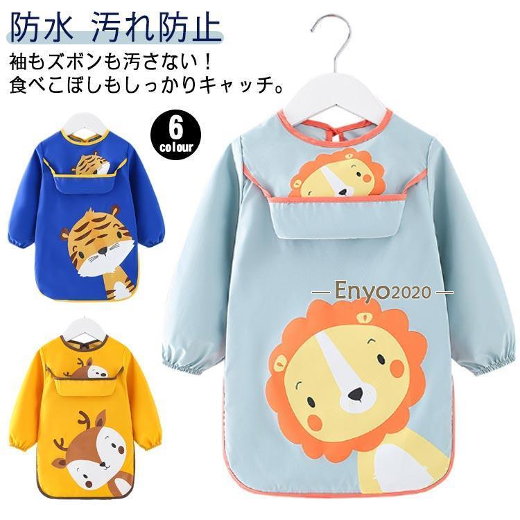 長袖スモック 食べこぼしキャッチ 女の子 上ポケット付き 幼稚園 汚れ防止 ロング お食事エプロン 防水 男の子 プレイウエア 子供用 長袖