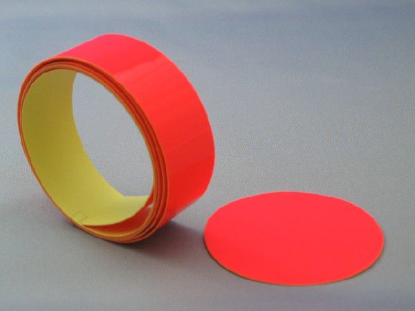 蛍光テープは、非常に鮮明な色で、普通色の3倍の距離から見える明るさな素材です。視界の悪い状態の雨天や、曇った時にも遠くから電灯の灯りの様に