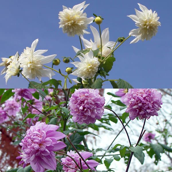 豪華な八重咲の皇帝ダリア、2色セットです。皇帝ダリアはメキシコ原産の巨大なダリアで、木立ダリア、ツリーダリアとも呼ばれる皇帝ダリアに、八重咲きが登場しました。植え付けて数ヶ月で2〜3mに伸び、秋から冬にかけて白の美しい八重花を咲かせます(★環境によっては、まれに一重咲きが咲く場合がありますが、2番花以降、また年数たつにつれて八重率あがります)。
