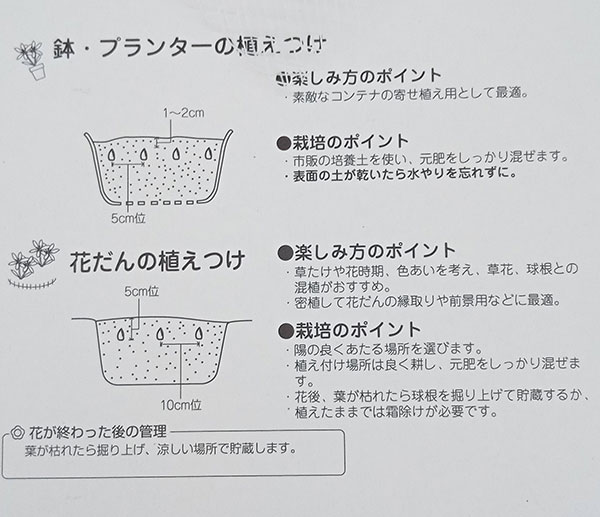 日当たりのよい場所を好みます。鉢植えの場合は、4号(直径12cm)ポットに3〜5球、球根の首が出るくらいの浅植えにします。地植えの場合は、5cm間隔で、球根の首が隠れるくらいの浅植えにします。元肥として、緩効性化成肥料や堆肥を少量施して植えつけてください。生育期には、月に1度、液肥を与えます。