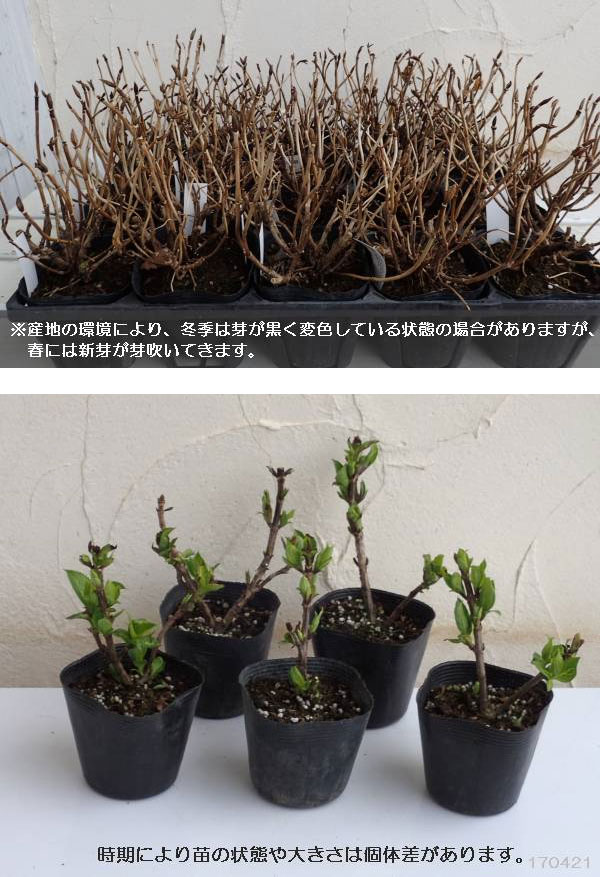 3.5号(直径10.5cm)ポット入りです。樹高等は入荷時期により異なります。お届け時期により剪定している場合があります。冬から春先は前年の秋に伸びた芽が冬の寒さで黒く変色し、一部の枝が枯れ込んでいる場合がありますが、気温が上昇すると新芽が出ます。開花は翌年以降となる場合があり、夏以降は葉焼け状態の場合がごあります。冬季は落葉です。写真は成長・開花時のイメージです。