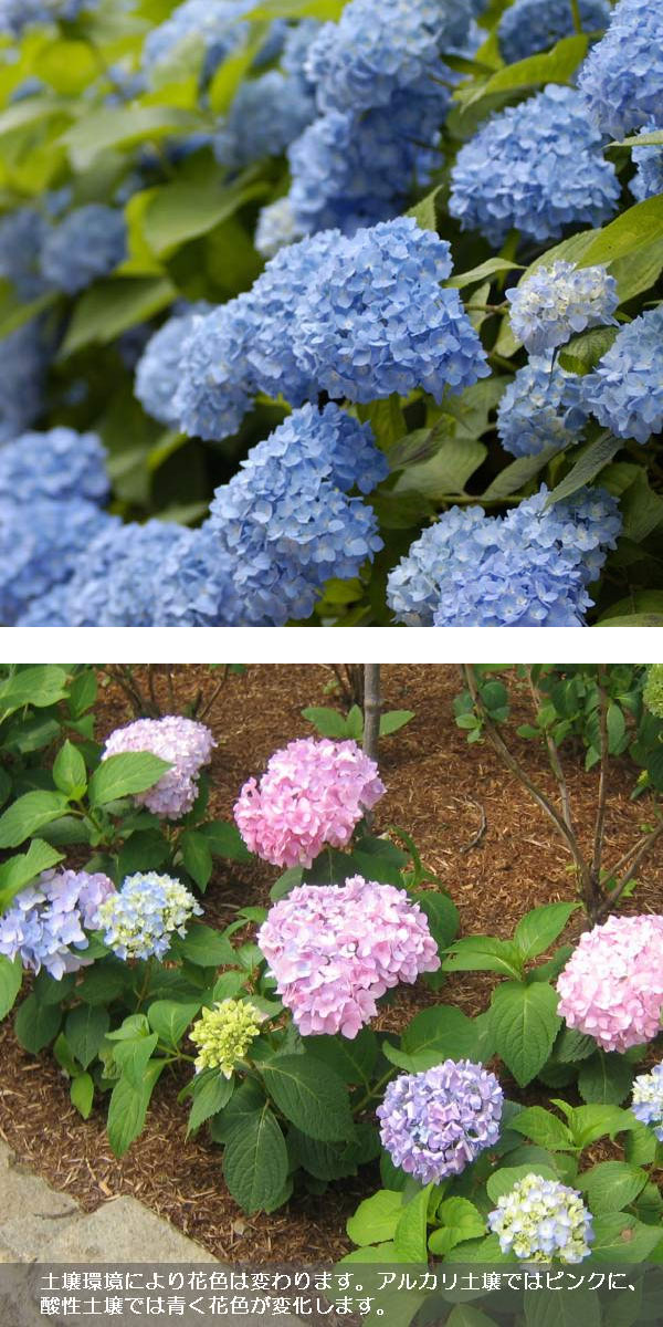 アジサイは土壌酸度により花色が変化します。栽培環境によっては写真の花色と異なる開花状況となる場合があります。