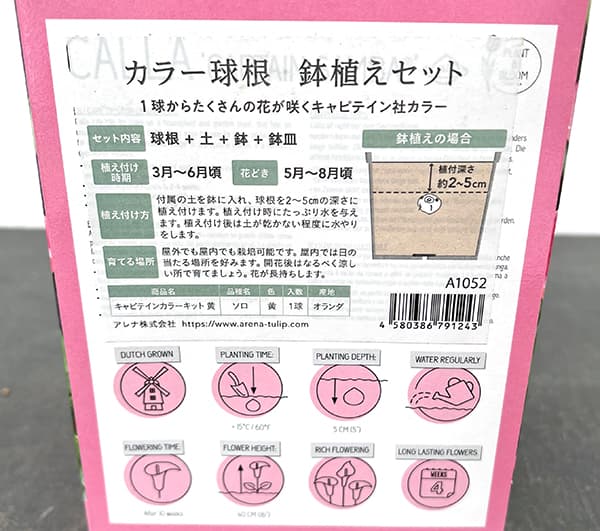 球根カラーの栽培セット キャプテン ピンク1球入りの栽培ガイド・