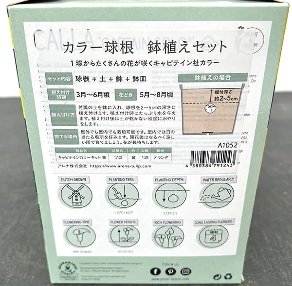 | セット内容 | カラー球根 1球、鉢、鉢皿、小袋用土、説明書 |