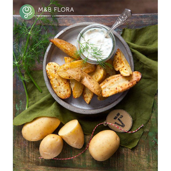 金のおつまみ芋は画期的な種子系(種から育てる)のじゃがいもです。従来のジャガイモは種芋を植えて栽培しますが、この品種は種から苗が生産され、苗を植えれば栽培できます。皮は白黄色、肉は淡い黄色で、やや粘質のじゃがいもです。ポットから苗を抜いて7号(直径21cm前後)の鉢に植え替えて育てると、1株につき約350gのじゃがいもが収穫できます。一般家庭で簡単に楽しくジャガイモの収穫を楽しんでいただける品種です。実は小ぶりで、皮も薄いため、収穫後すぐは皮を剝かずに調理がおすすめで、煮崩れの心配も少ないです。小スペースで栽培でき、プランター栽培にも向く品種です。