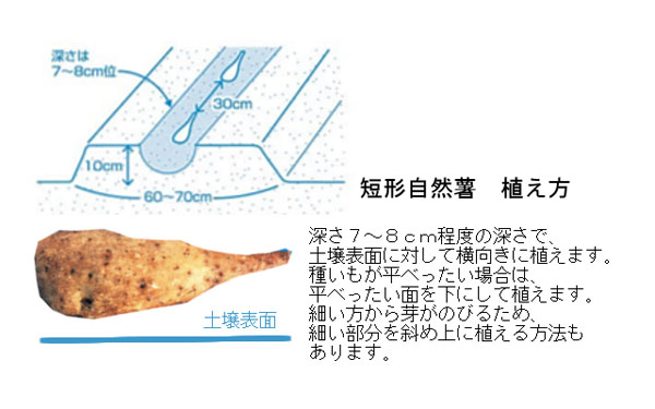 よく耕した場所に30cm位の間隔で7cm位の深さに横向きに植え付け、土をかけます。細い部分から芽が伸びるため、細い部分を斜め上にする方法もあります。
