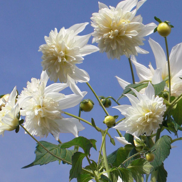 メキシコ原産の巨大なダリアで、木立ダリア、ツリーダリアとも呼ばれる皇帝ダリアに、八重咲きが登場しました。植え付けて数ヶ月で2〜3mに伸び、秋から冬にかけて白の美しい八重花を咲かせます(★環境によっては、まれに一重咲きが咲く場合がありますが、2番花以降、また年数たつにつれて八重率あがります)。