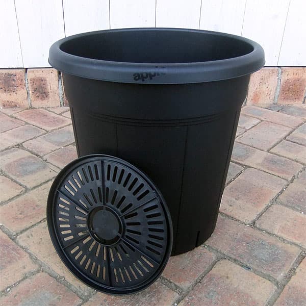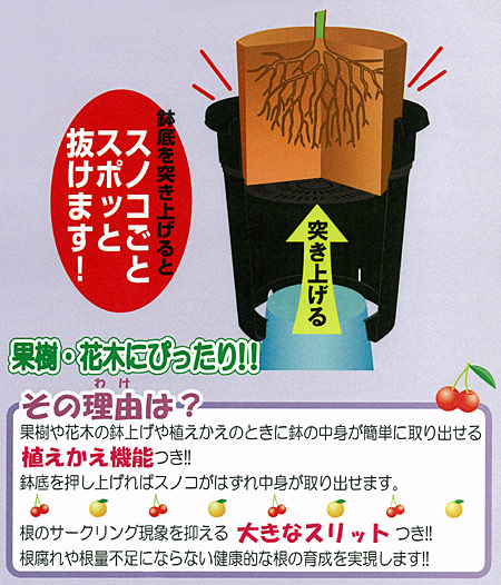 果樹・花木の栽培に適した、土容量タップリで安定感のある深型プラ鉢です。水はけ・空気の流通のがよいスリット付きです。底のスノコがとりはずせる機能付きなので、植え替え(鉢上げ)に便利です。(写真はスノコを取り外して立てかけている状態です。)