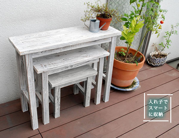 天然木にアンティーク風のペイントがおしゃれなネスとテーブルセット。花台やちょっとした小物置きスペースとして活躍します。入れ子式に収納できるのでコンパクトです。天然木に木目を生かしたアンティーク調の塗装がおしゃれです。