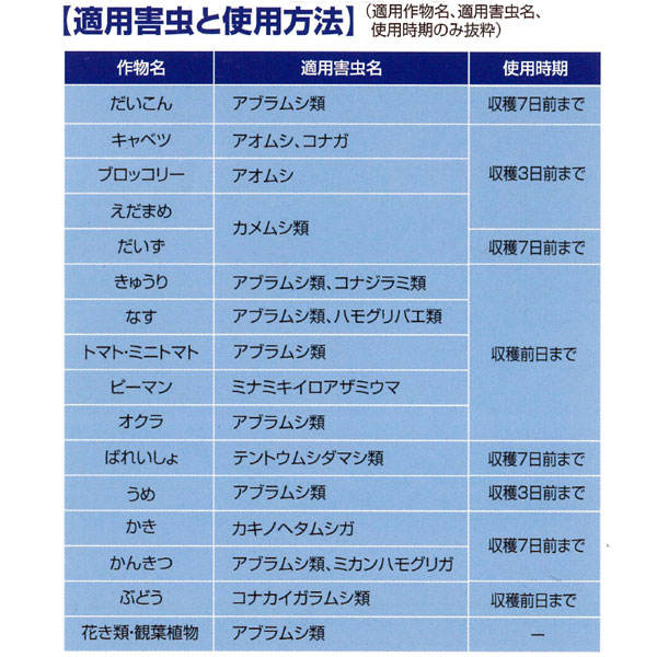 アブラムシ類、カメムシ類、テントウムシダマシ類、コナカイガラムシ類、アオムシ、カキノヘタムシ、ミカンハモグリガ、コナガ