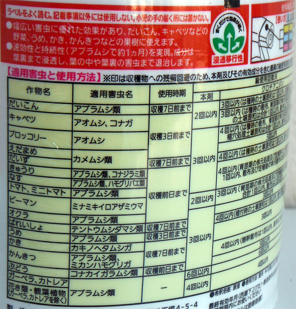 この薬剤の適用一覧及び使用法についてはKINCHO園芸(旧住友化学園芸)のホームページをご参照ください。