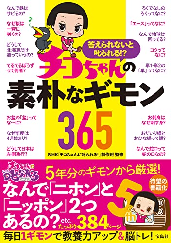 永遠の5歳児チコちゃんの“5thアニバーサリーイヤー”に発売される待望の一冊 過去に番組で取り上げた「てるてるぼうずって何者」「どうして北海道だけ道っていうの」「なぜ年度は4月始まり」といった素朴なギモンを365も詰め込んだ事典的な大作がついに完成です。 1日1ギモン、楽しく教養を身につけ、チコちゃんに「ボーっと生きてんじゃねーよ」と叱られない素敵な大人を目指しましょう。 番組のファンはもちろん、番組を見ていない人でも楽しめます。
