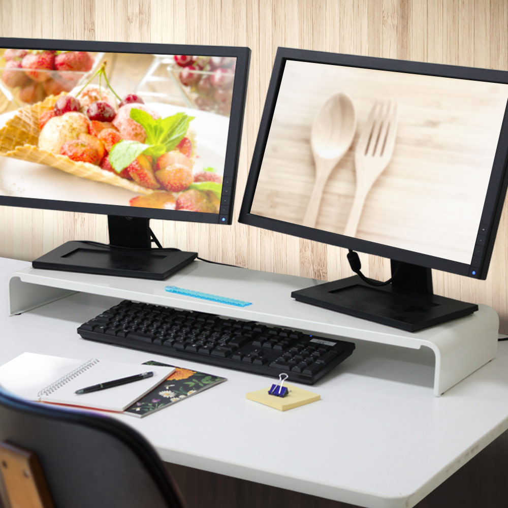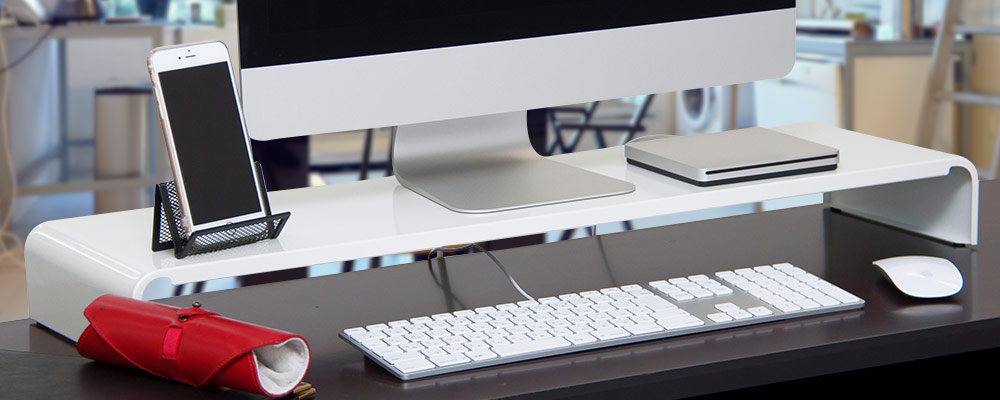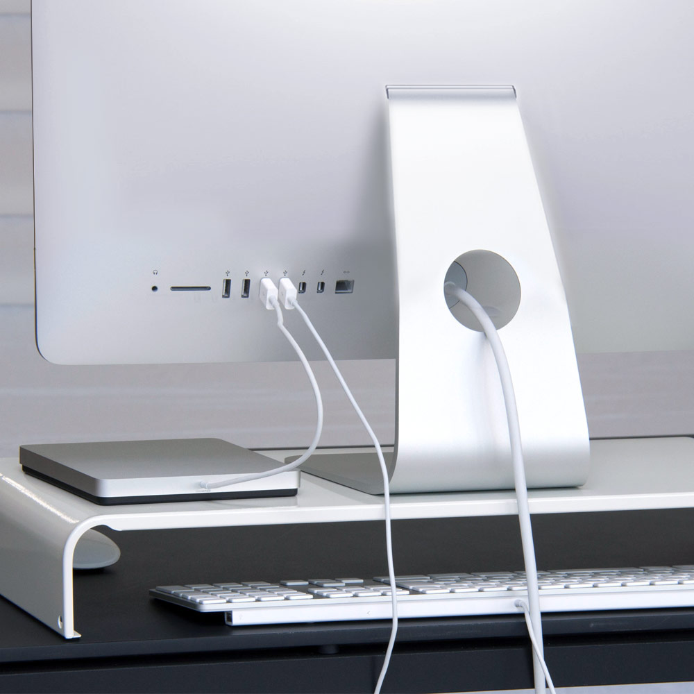 | キーボードをすっきり収納できる便利なPCモニタースタンド。机の上がすっきり片付き、作業スペースが広がります。 | シンプルだけど、耐荷重約20kgと頑丈な作り。背面の配線周りの邪魔をせず、すっきりと設置できます。 | |