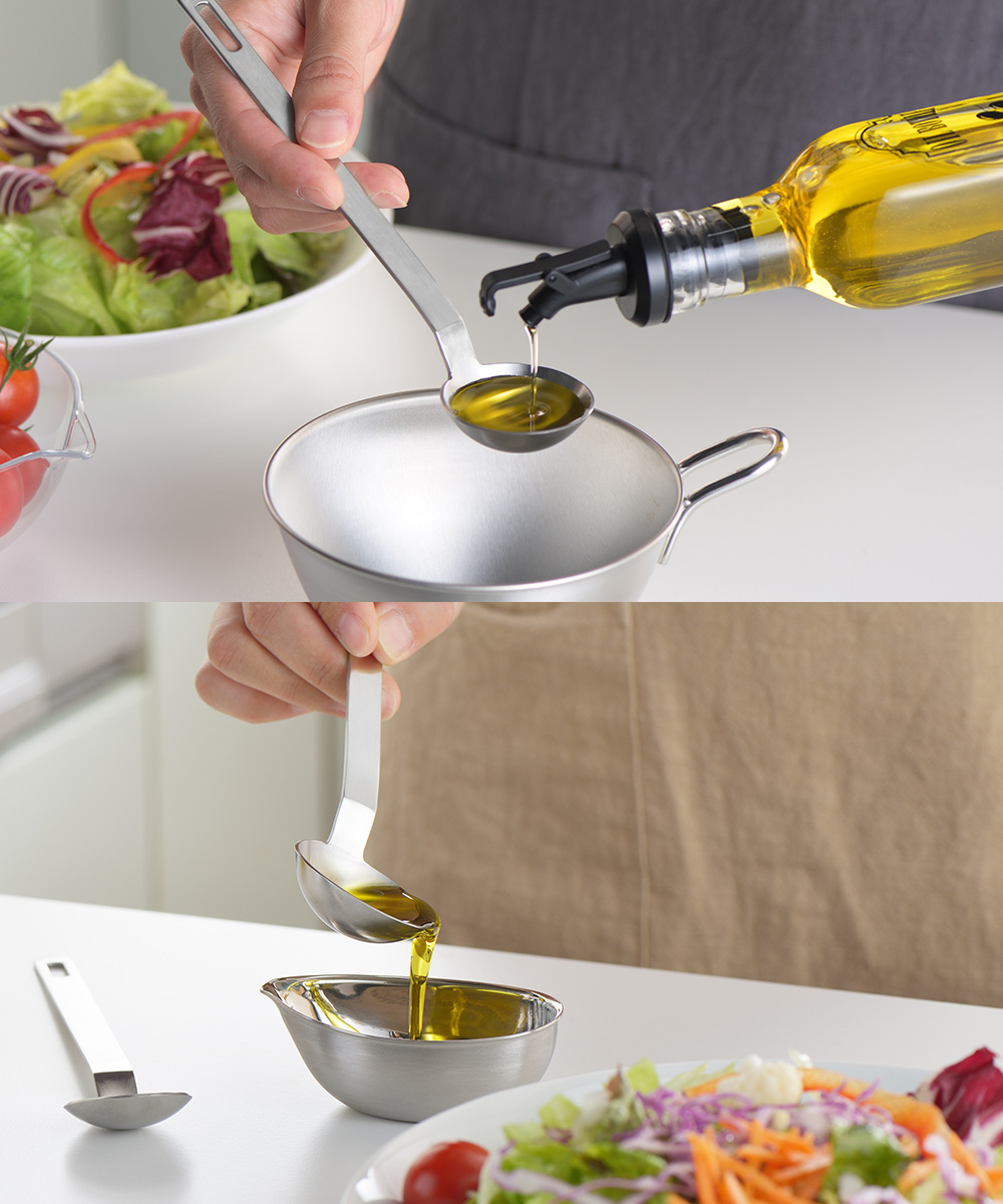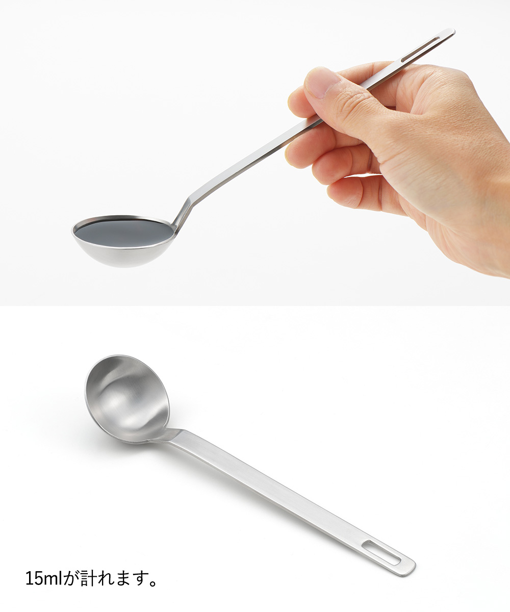 手に持った時、皿が水平になるように設計されているので、計る、すくうがしやすいスプーンです。