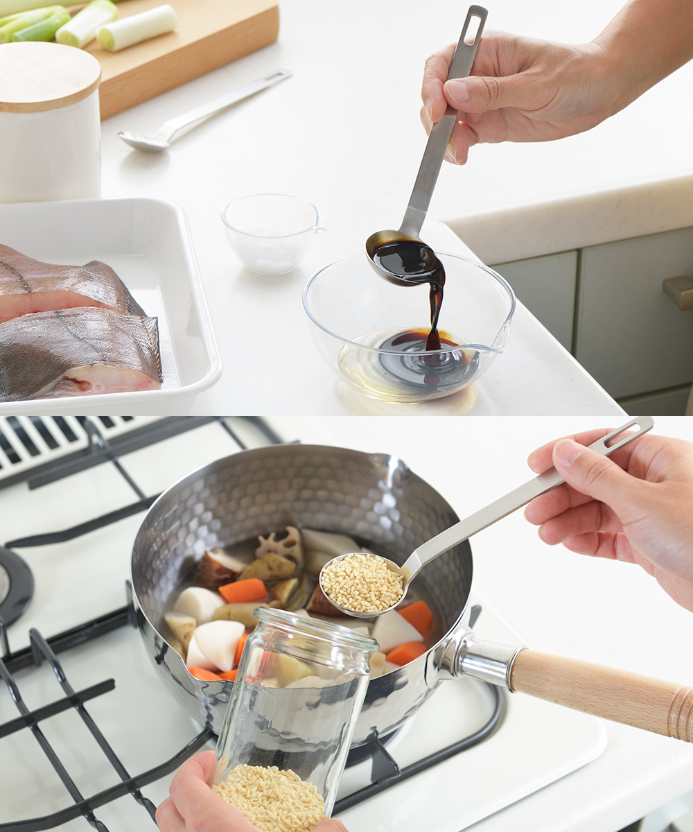 柄が長いので袋入りや長めの瓶の調味料もサッとすくえる。