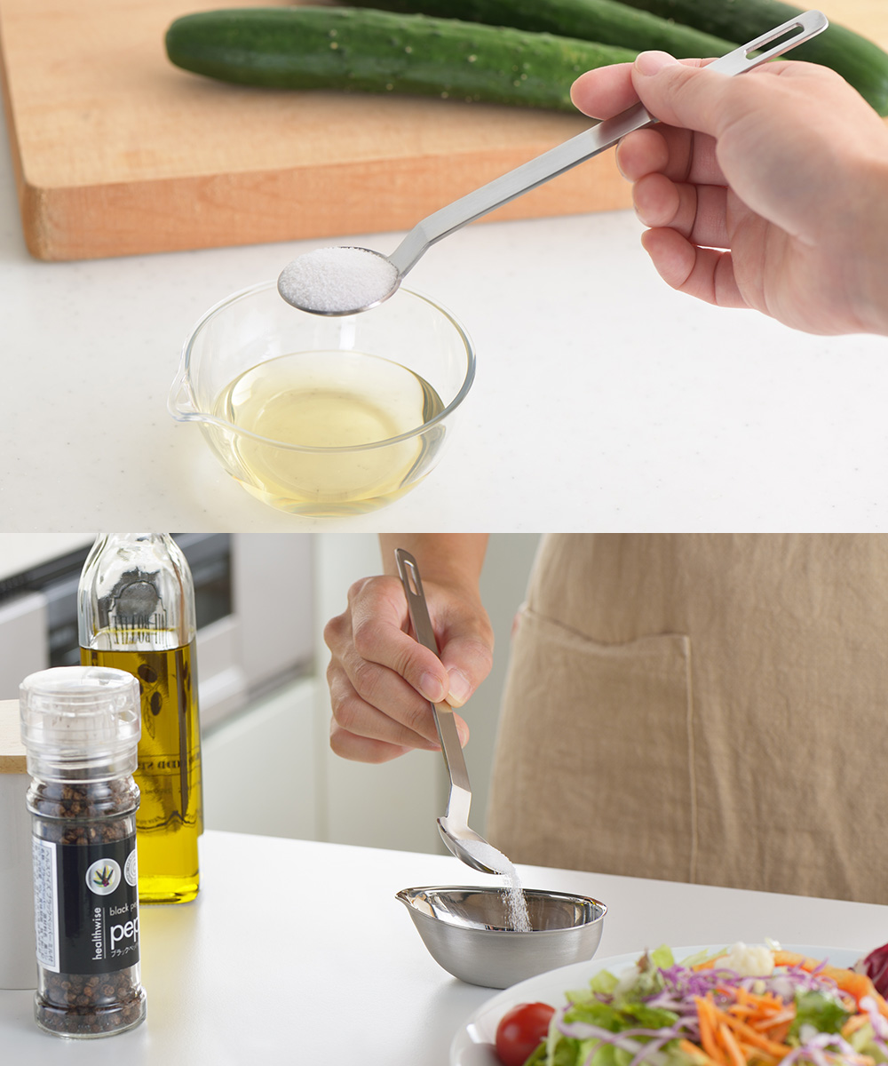 持った時に皿部分が水平になるよう設計されているので、「計る」「すくう」といった作業がしやすくなっています。