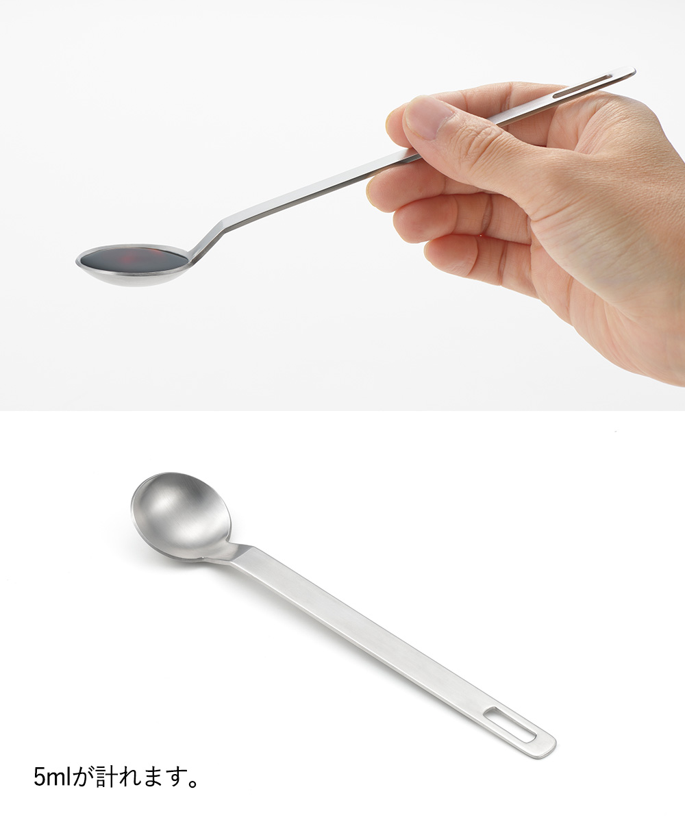 持ち手が15cmと長い柄が特長の計量スプーン。袋入りの粉や瓶の中の調味料もサッとすくえます。