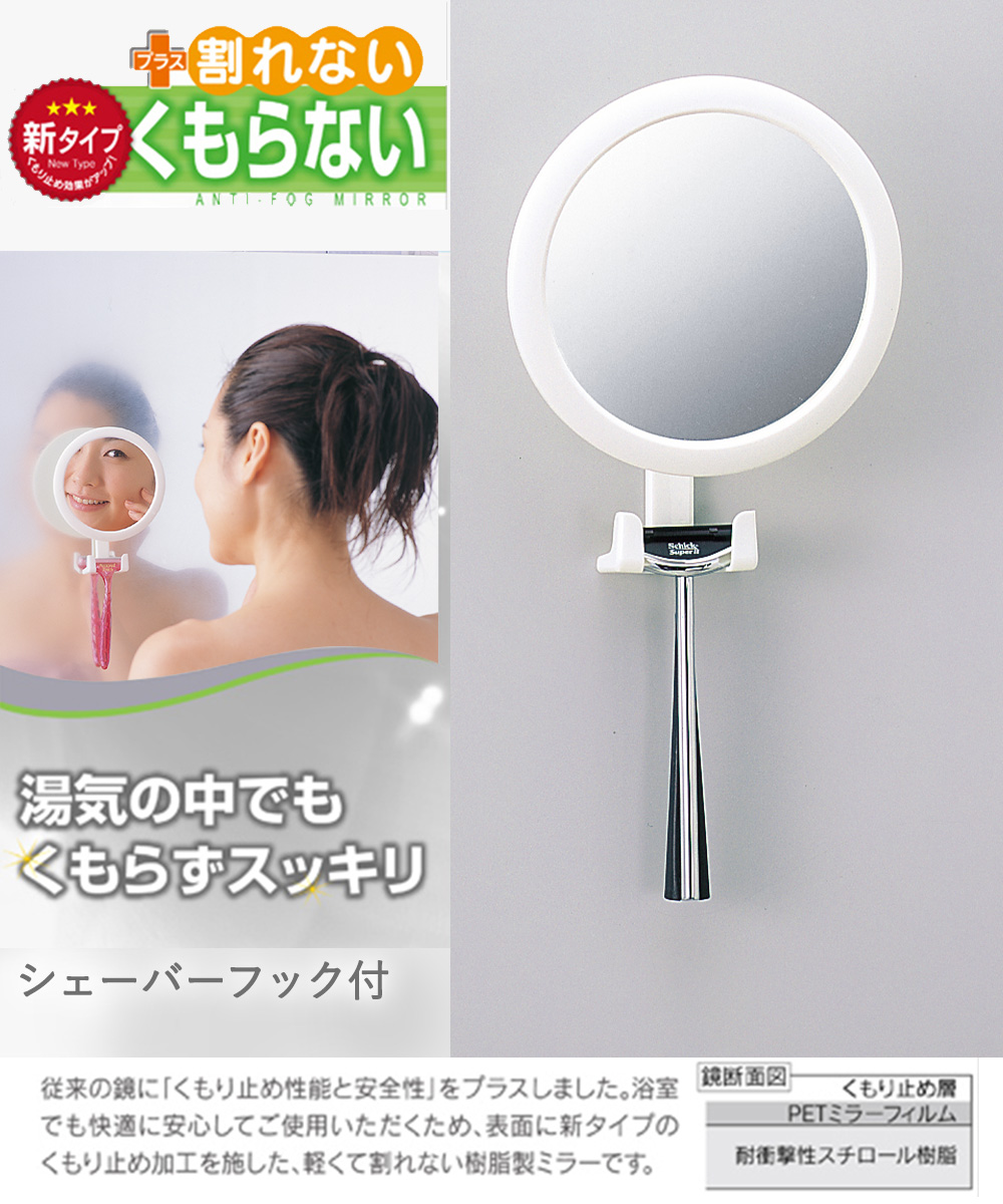 本体:耐衝撃性スチロール樹脂 吸盤:塩化ビニル樹脂 シェーバーフック:ポリプロピレン ミラー:PETフィルム・耐衝撃性スチロール樹脂