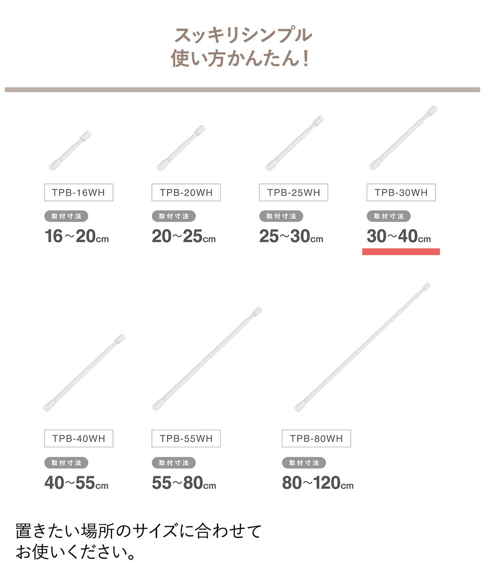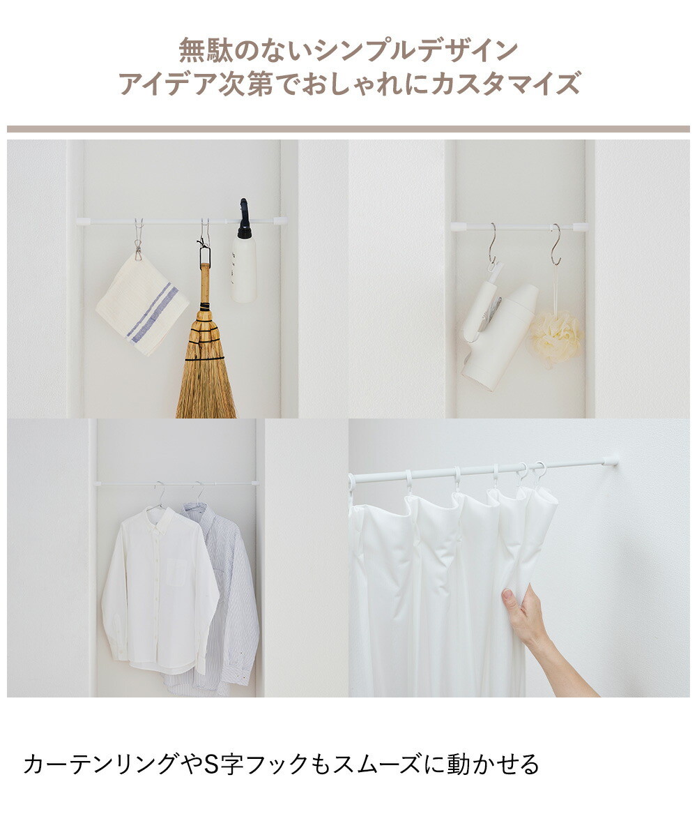 暮らしにフィットするシンプルなデザインの突っ張り棒です。バネ式で簡単に取り付け・取り外しできます。
